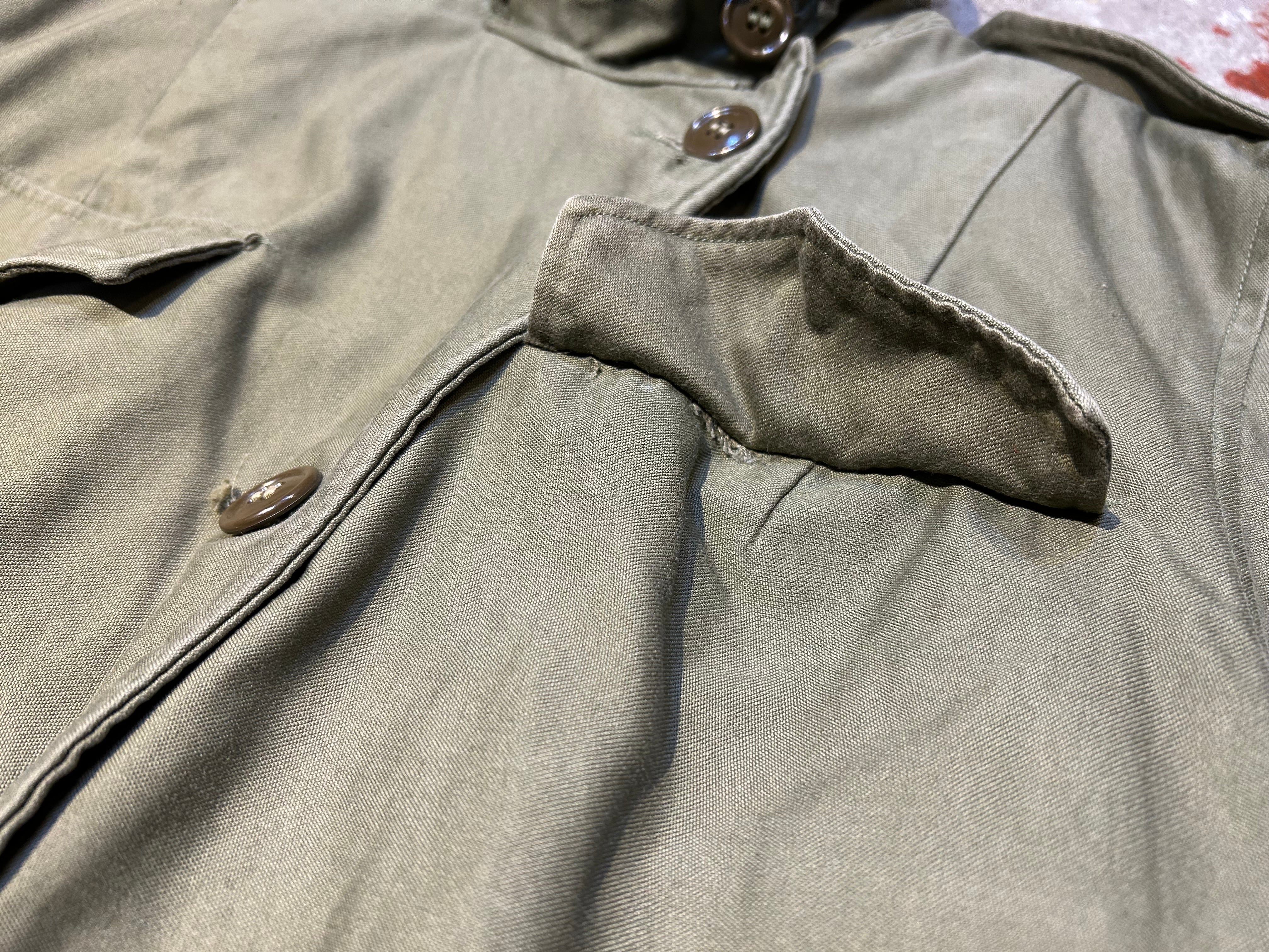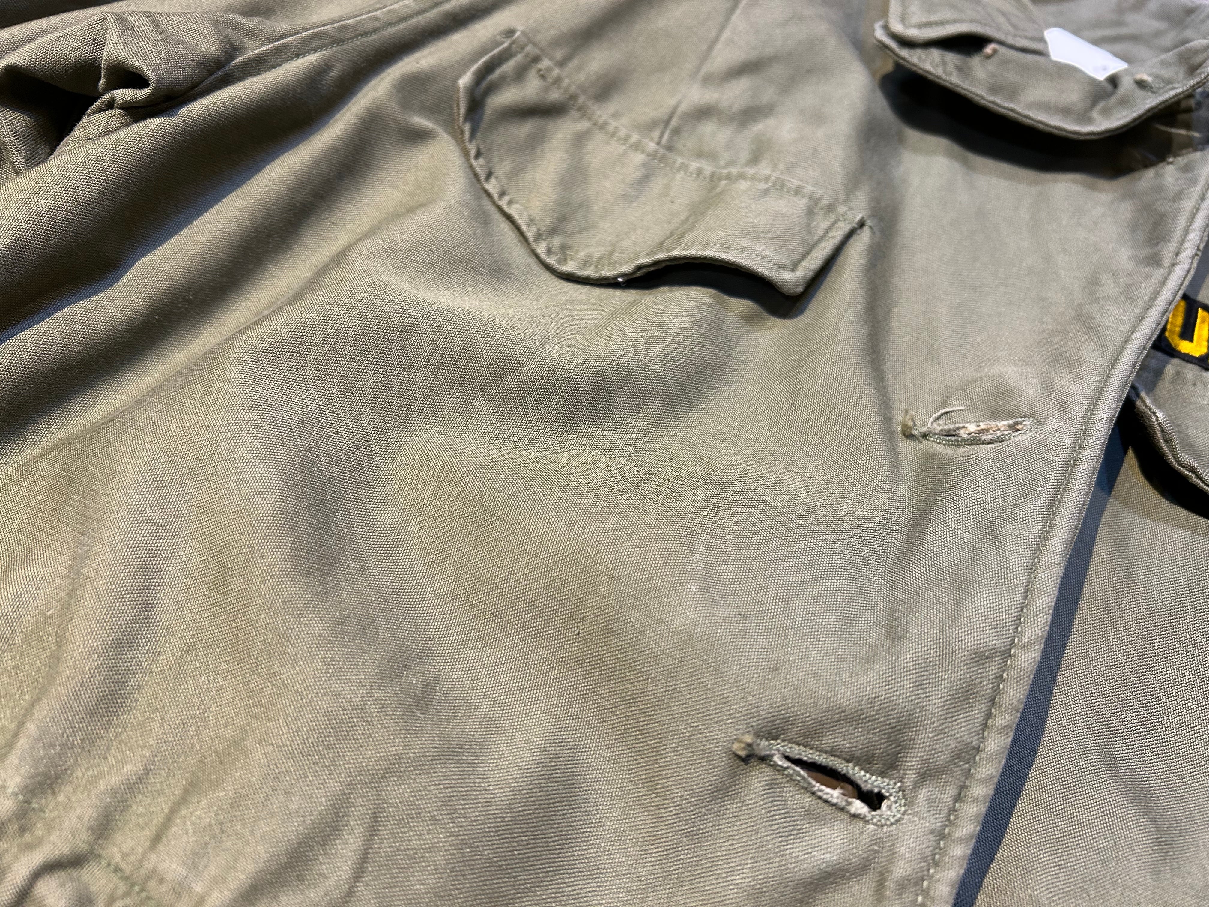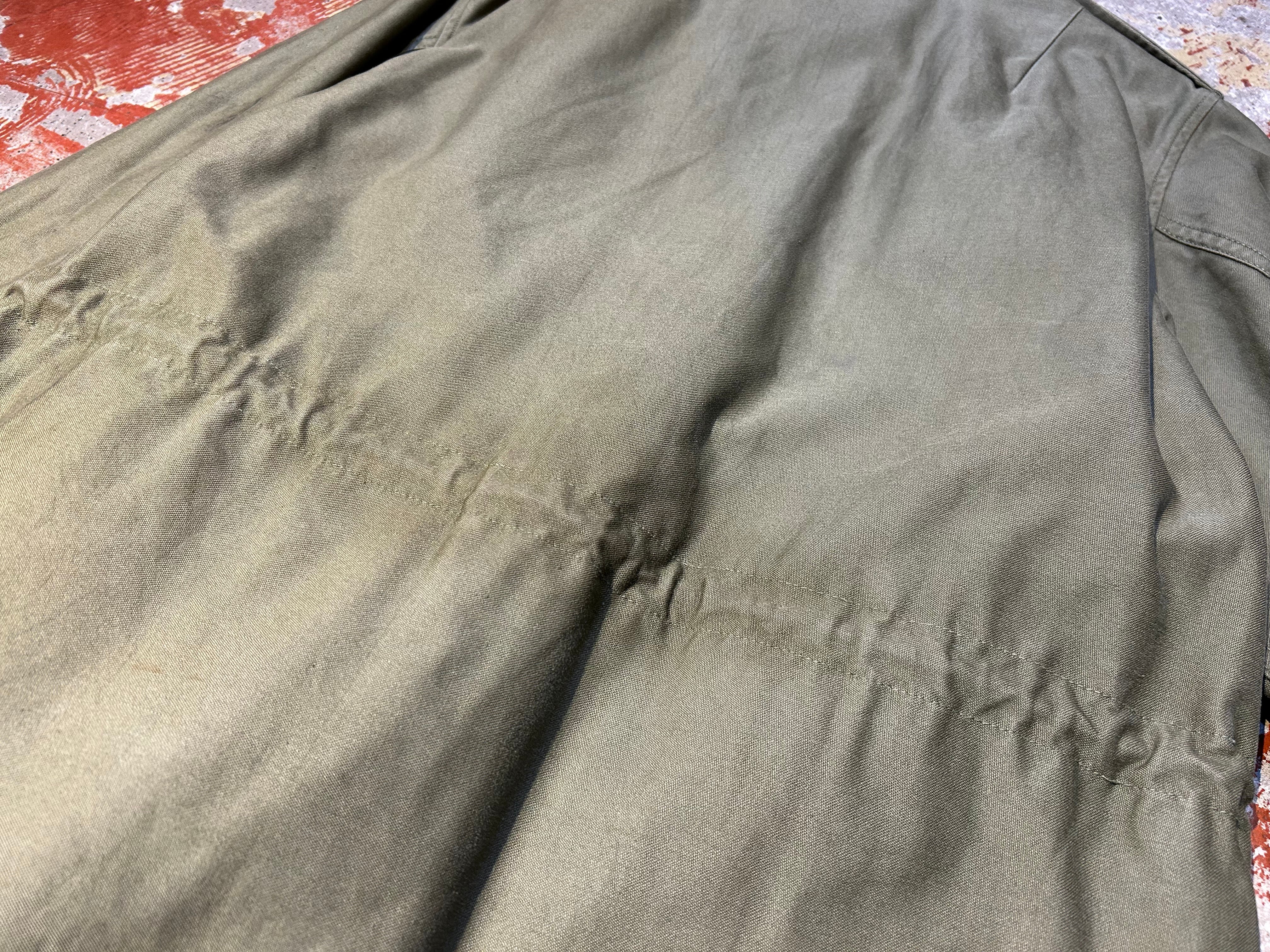 コンディション:裏油染みの様なものが、若干表背中のドローコード付近に滲んでおります。フロント第二第三ボタン付近白い汚れ、肩や袖に汚れ等ございますが、風合いとしてお楽しみ頂けると思います。その他特筆するようなダメージもなく、ビンテージにご理解頂いている方でしたら気にならない程度だと思われます。